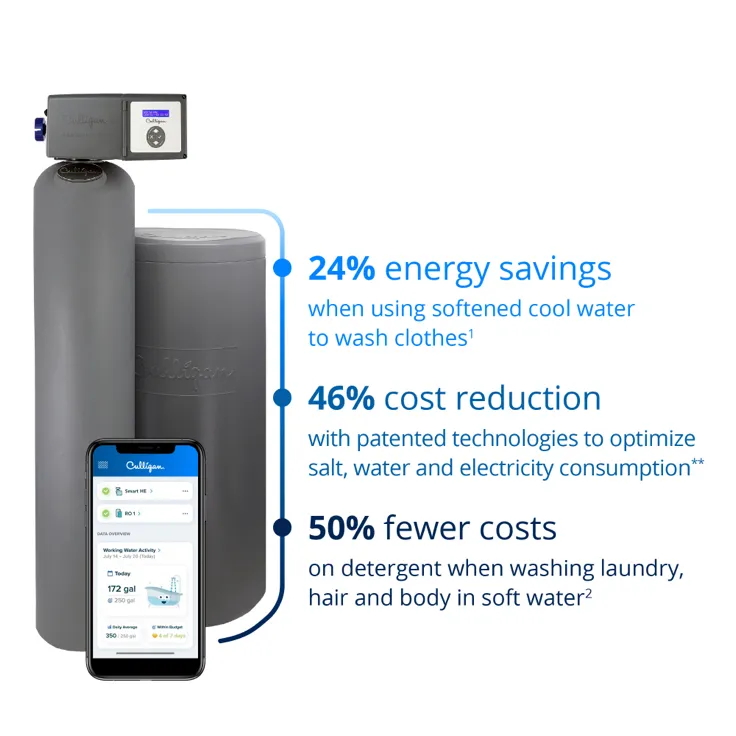 Culligan’s Aquasential® Smart High Efficiency water softeners are designed to deliver reliable, whole-home soft water while minimizing salt use, water waste, and operating costs. Both models use advanced, demand-based technology and smart connectivity to adapt automatically to your household’s actual water usage.